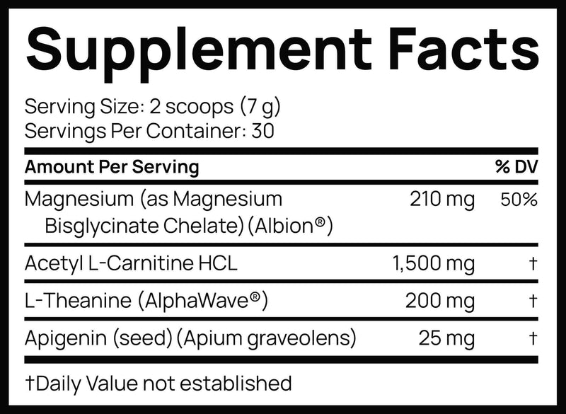 It features TRAACS® Magnesium Bisglycinate, a fully reacted form known for superior absorption and digestive comfort. Also included are Acetyl L-Carnitine to support brain energy, AlphaWave® L-Theanine for calm focus, and Apigenin, a natural flavonoid known for its mood-supportive properties.*